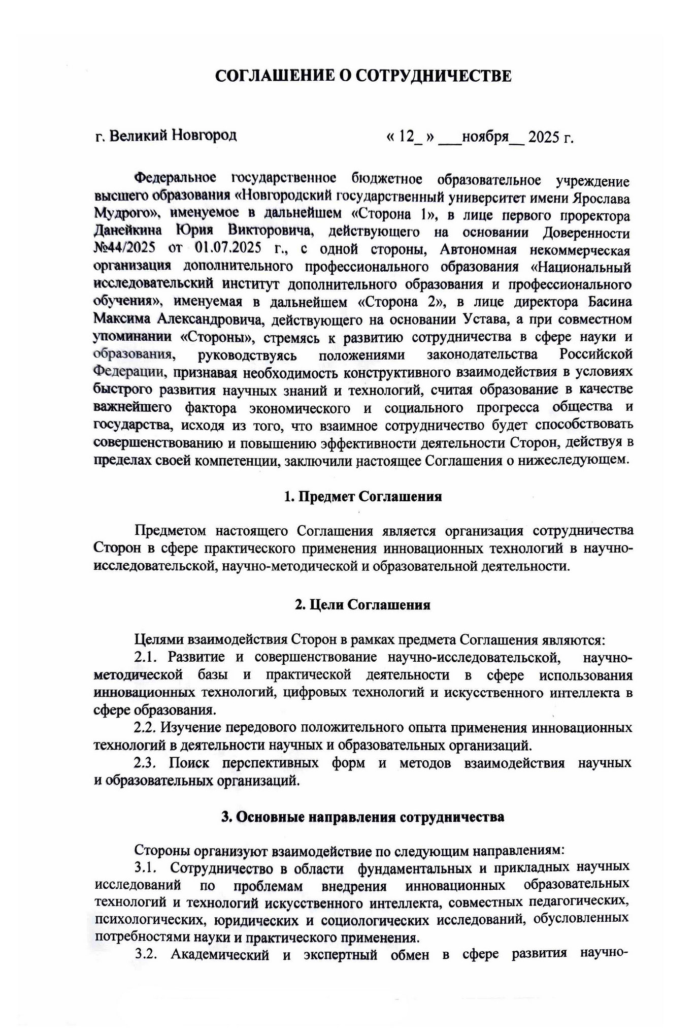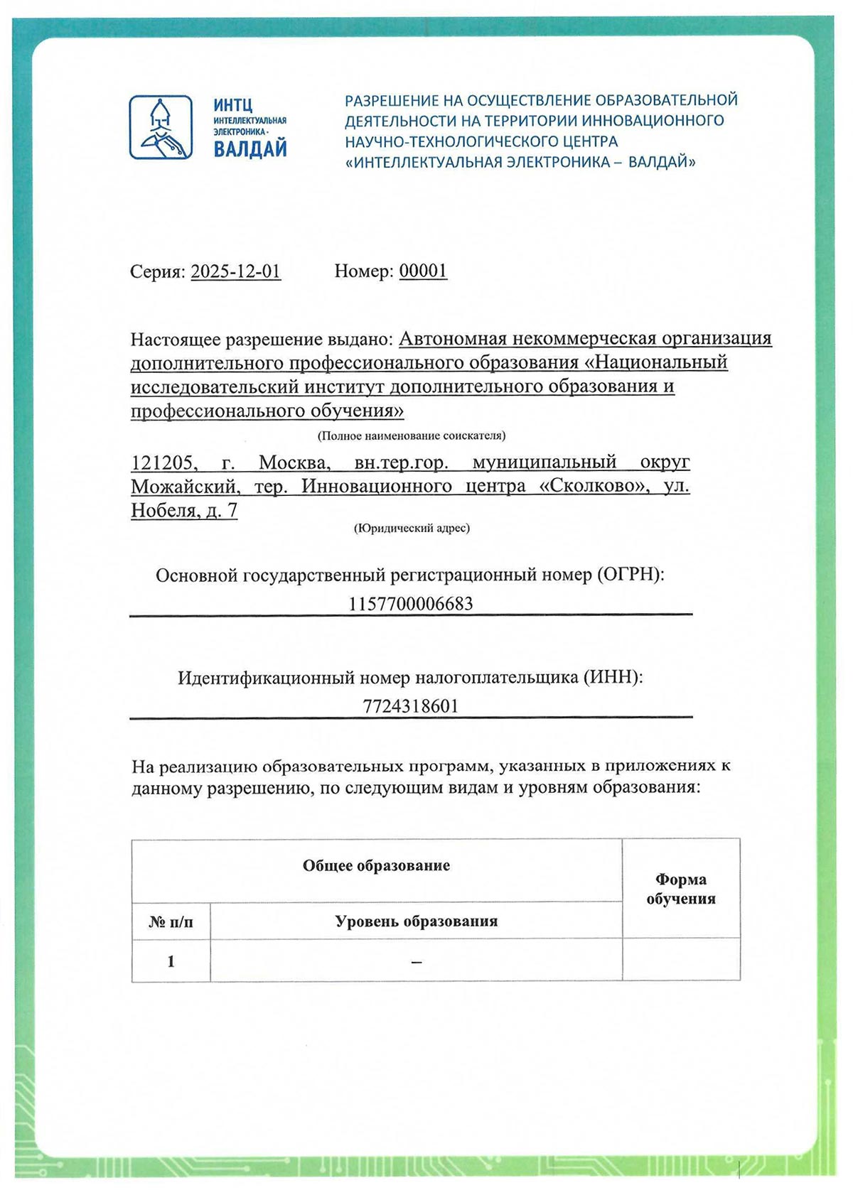 Разрешение на осуществление образовательной деятельности на территории Инновационного научно-технологического центра «Интеллектуальная электроника - Валдай» серии 2025-12-01 № 00001