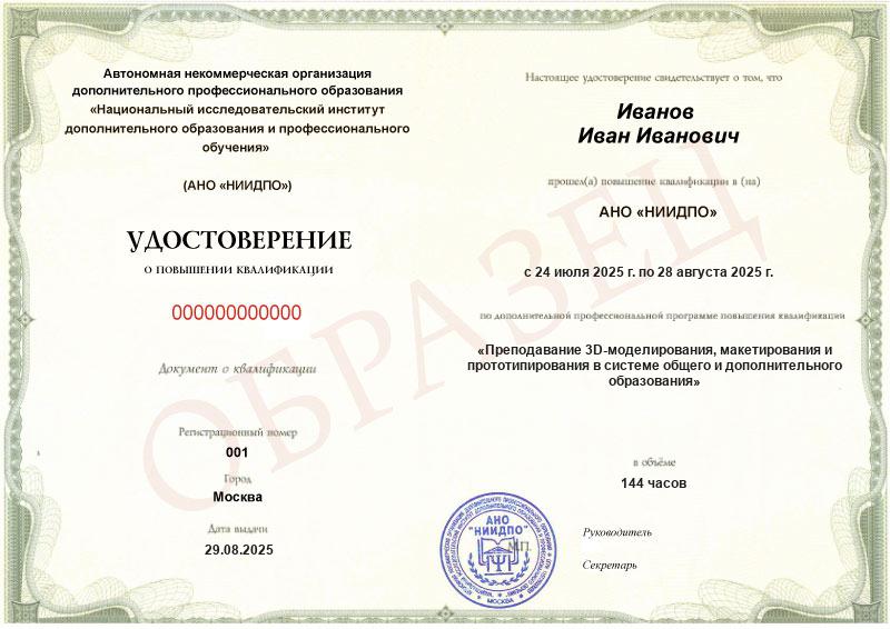 Преподавание 3D-моделирования, макетирования и прототипирования в системе общего и дополнительного образования (144ч)
