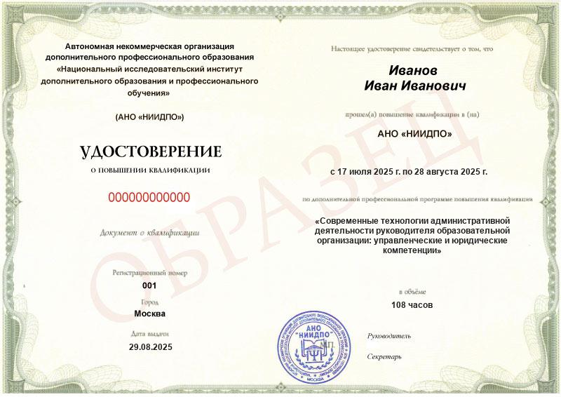 Современные технологии административной деятельности руководителя образовательной организации: управленческие и юридические компетенции (108ч)