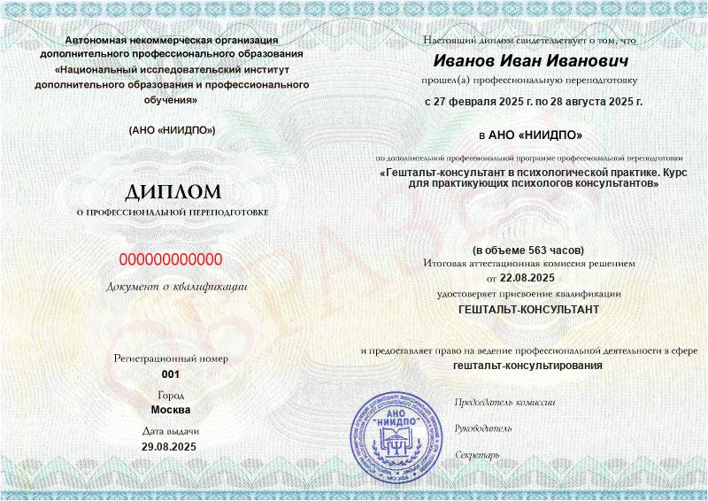 - Диплом о профессиональной переподготовке установленного образца с правом на ведение профессиональной деятельности в сфере психологического консультирования