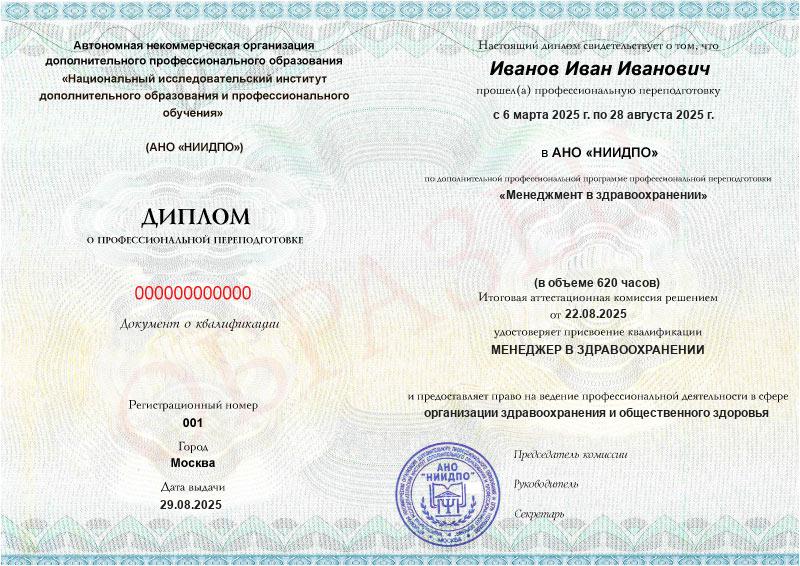 Вы получите диплом о профпереподготовке установленного образца и право работать менеджером в системе здравоохранения.