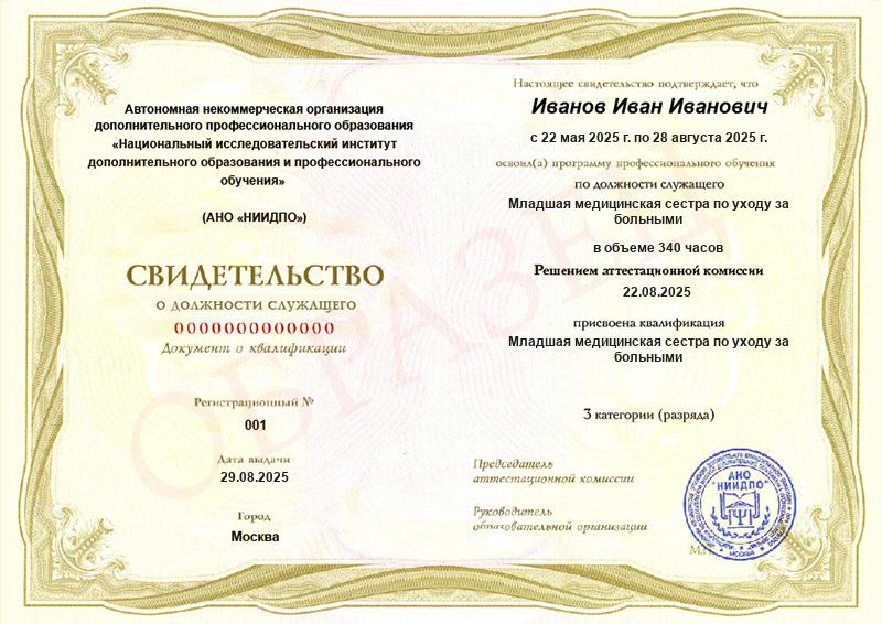- Квалификация: Младшая медицинская сестра по уходу за больными