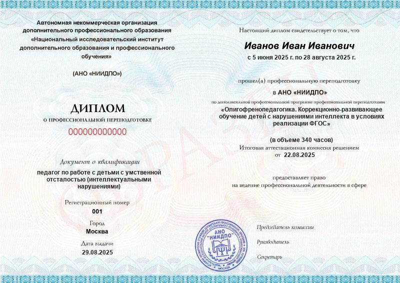 • Квалификация: педагог по работе с детьми с умственной отсталостью (интеллектуальными нарушениями)