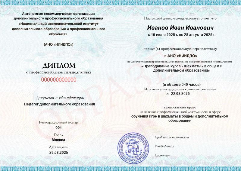 Отзыв об обучении в АНО ДПО «Национальный исследовательский институт дополнительного образования и профессионального обучения». Я прошёл курс профессиональной переподготовки по программе «Преподавание курса «Шахматы» в общем и дополнительном образовании» в АНО ДПО «Национальный исследовательский институт дополнительного образования и профессионального обучения» . Обучение проходило дистанционно, что было очень удобно. Все материалы были изложены понятно и доступно, платформа для обучения работала стабильно. Преподаватели оперативно отвечали на вопросы, давали подробные разъяснения. Особенно порадовало, что курс был ориентирован не только на методику преподавания шахмат, но и на общепедагогические знания, необходимые для успешной работы с детьми. Благодарю всю команду института за качественное обучение и профессиональный подход. Полученные знания и документы позволят мне уверенно работать по новой специальности. Рекомендую обучение в этом учреждении всем, кто хочет получить качественное образование и повысить свою квалификацию.
