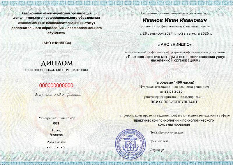 Диплом о профессиональной переподготовке от АНО «НИИПДО»Диплом действует на территории всей России и признается государственными и частными организациями