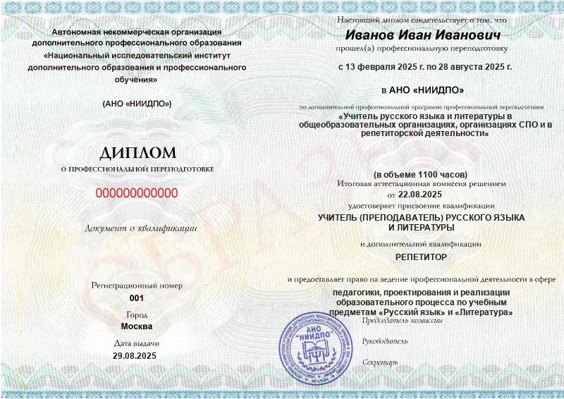 - 2 квалификации: Учитель (преподаватель) русского языка и литературы + Репетитор