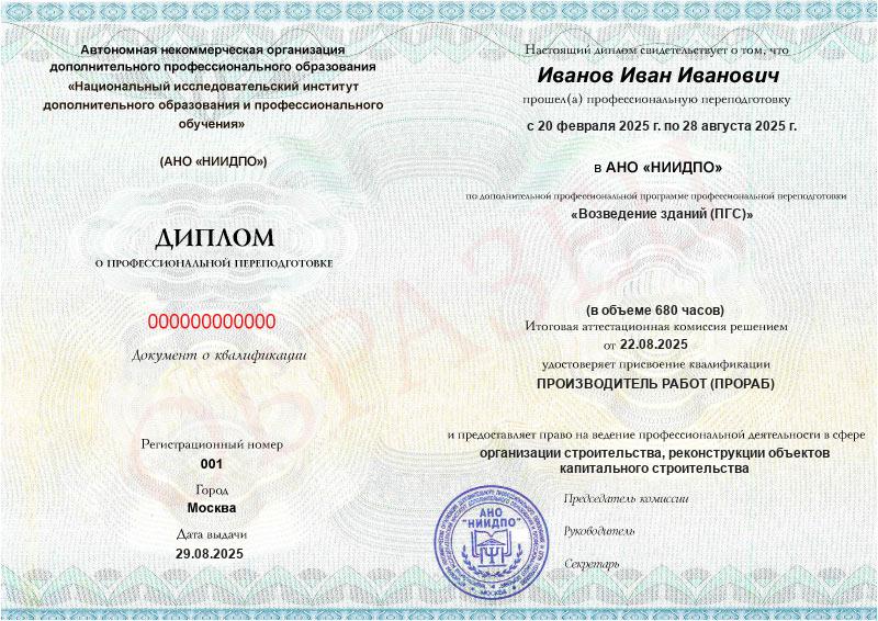• Выдача диплома о профессиональной переподготовке с присвоением квалификации «Производитель работ (прораб)»