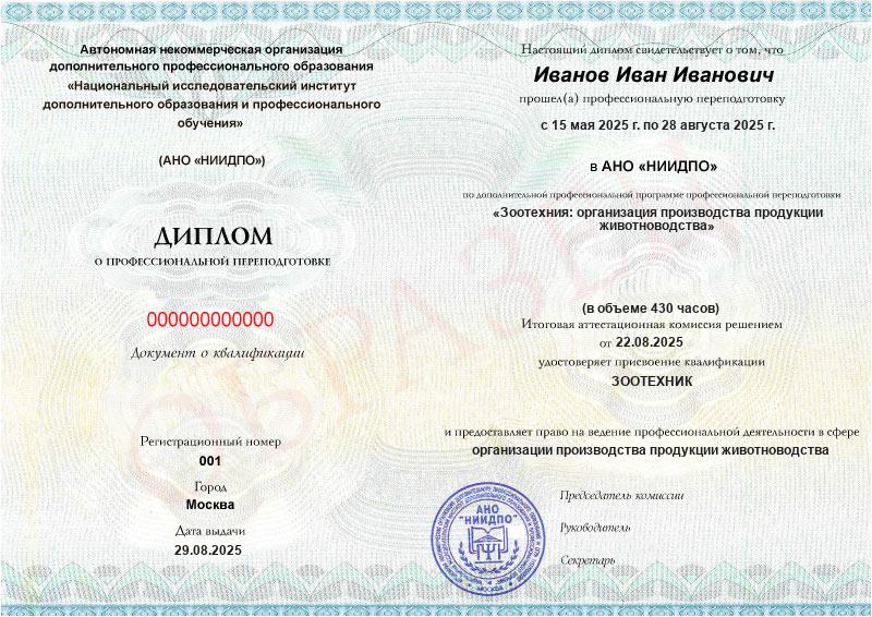 - Квалификация: Зоотехник